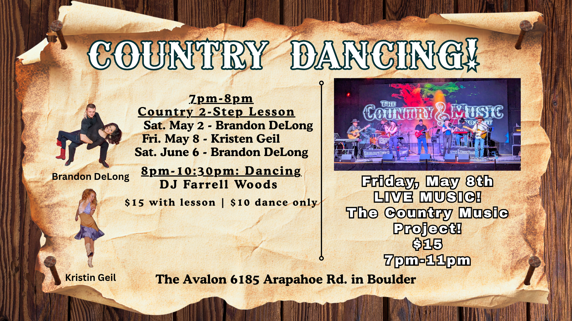 We Kick off the night with a 2 Step lesson at 7 PM led by the talented Brandon DeLong on Saturdays. Fridays with various instructors TBA. No matter if you’re a beginner or looking to brush up your moves, this is the perfect way to start the evening.